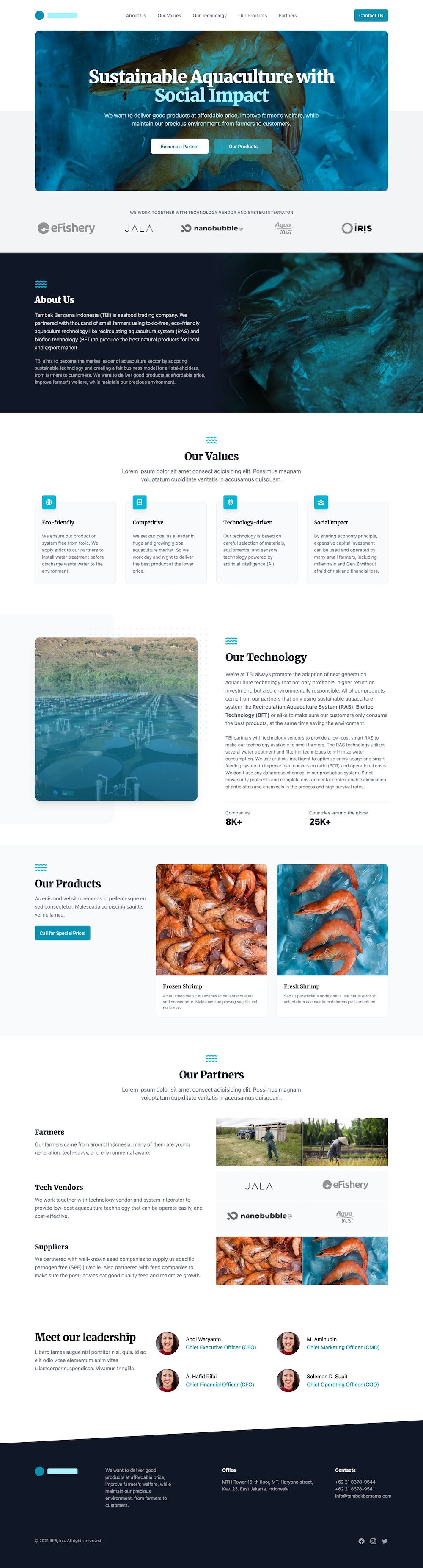 Designed a professional and informative website for Tambak Bersama Indonesia (TBI), a seafood trading company committed to sustainable aquaculture. The website highlights TBI’s partnerships with thousands of small farmers and its use of eco-friendly technologies like Recirculating Aquaculture System (RAS) and Biofloc Technology (BFT) to produce high-quality, toxin-free seafood. With a clean, modern interface, the design emphasizes transparency, sustainability, and trust, featuring easy navigation, engaging visuals, and clear storytelling to appeal to both local and international markets.